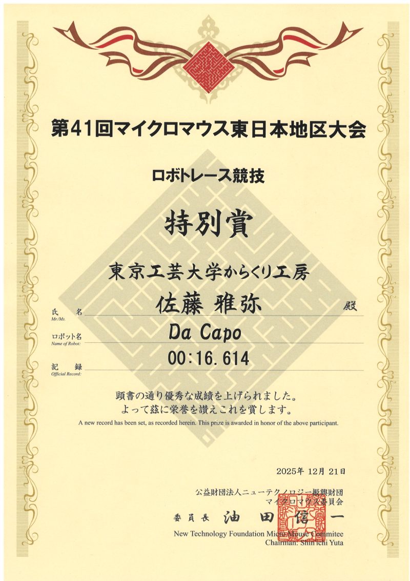 2025年12月20日(土),12月21日(日)に東京工芸大学:厚木キャンパスで開催された第41回マイクロマウス東日本地区大会にからくり工房のマイクロマウス班とロボトレース班が出場し,ロボトレース班が特別賞を受賞しました!