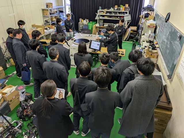 からくり工房&ロボットビジョン研究室:高校見学対応で学内デモを実施しました! 2026.01.242026.01.23 2026年1月23日(金),沼津工業高等学校の生徒約15名が来校し,ロボカップ,マウス,トレース,相撲の競技ロボットのデモを行いました!