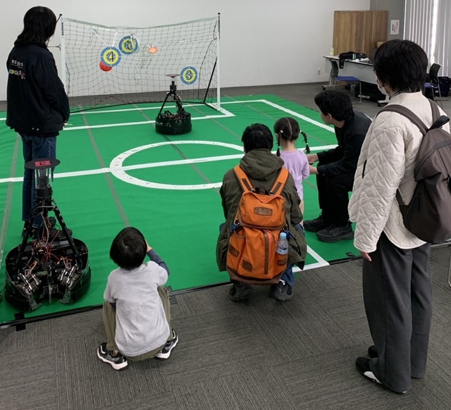 ロボカップ中型リーグのデモフィールドを敷設し,コントローラーによりロボットを操縦してゴールにぶら下げた得点の的をキックで当てる体験操縦を実施しました.