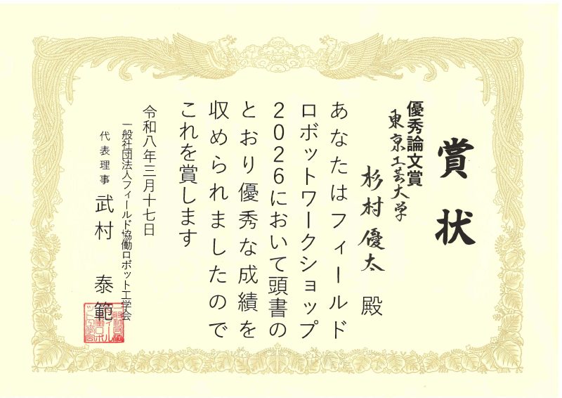 2026年3月16日(月),17日(火),東京工芸大学厚木キャンパス15号館で開催されたフィールドロボットワークショップにロボビ研全員が参加しました!ロボビ研からは3件の講演発表と,1件のテクニカルチャレンジ(ロボットデモ)を行い,優秀論文賞を受賞しました!懇親会では参加した大学の学生同士で活発な交流があり,有益な情報交換が行われました.